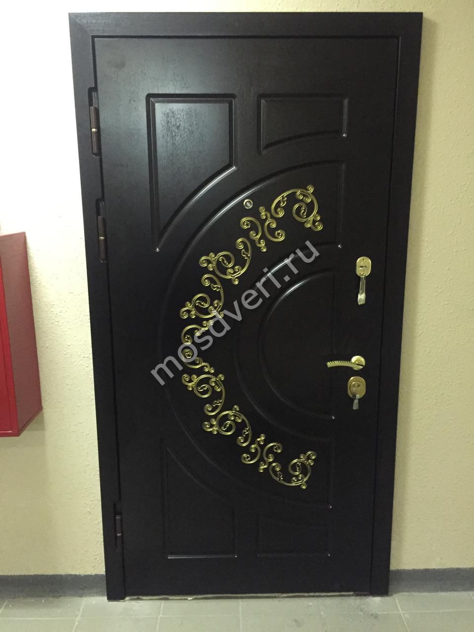 Элитная входная дверь коричневая с золотым узором — оформите заказ прямо сейчас! Позвоните нам, и узнайте точную цену уже сегодня. Выезд специалиста — по вашему графику!